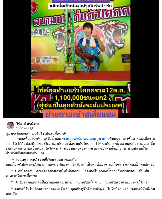 หลังเกิดกระแส ดราม่าซื้อขายไก่ชนค่าตัว 1 ล้านบาท เมื่อวานนี้ ล่าสุดทั้งสามฝ่าย