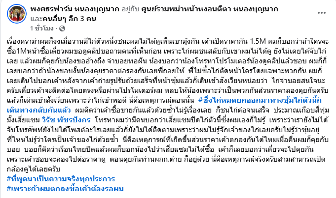 โดยได้บอกว่าในวันนั้น บอล พงศธรฟาร์ม เป็นผู้ต่อรองกับเจ้าของไก่จาก