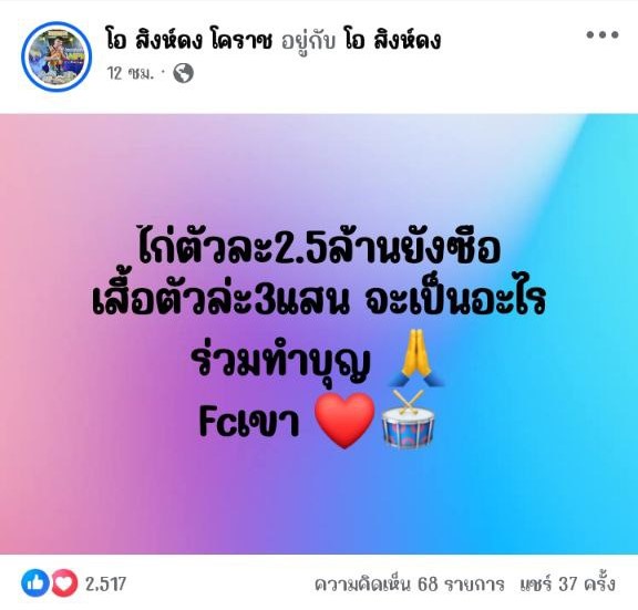 “เสื้อตัวนี้ผมขอเลย 3 แสน เอามาส่งผมได้เลยครับ เป็นไก่ตัวละ 2.5 ล้านยังซื้อ เสื้อตัวละ 3 แสนจะเป็นอะไร! ร่วมทำบุญด้วย ผม FC เขา!”