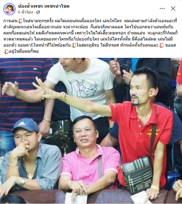 “เสี่ยเปิ้ล” โพสต์ พูดถึงในฐานะคนเล่นไก่ ในสนามจริง เล่นตามกำลังตัวเอง และเล่นเพราะอยากเล่นจริง ๆ ไม่เคยเล่นเผื่อใคร หรือเล่นแทนใครทั้งนั้น เสี่ยเปิ้ลบอกตรง ๆ ว่า ถ้าใครไปพูดว่าเล่นหุ้นกับเขา หรือเขาเล่นให้ใคร เจ้าตัวบอกเลยว่า “ตีเก๊หมด” เพราะสไตล์ของเขาคือเล่นเอง รับเองทั้งหมด “ถ้าผมจะเล่น ลูกละกี่ล้านก็หวดมาแล้ว ไม่เคยมองหาใครหรือไปแบ่งกับใคร เล่นให้ใครทั้งนั้น” ในมุมของเสี่ยเปิ้ล สนามไก่คือสมรภูมิจริง คนกับไก่ต้องยืนไปด้วยกัน ไม่มีการทรยศหรือหักหลัง ไม่ว่าจะกับคนหรือกับไก่ที่อยู่ในมือ เล่นแบบไม่ออกตัว ไม่สร้างภาพ จะมากจะน้อยก็เล่นตามกำลัง แต่ถ้าลงสนามเมื่อไหร่ ก็พร้อมยืนให้สุดเกม สำหรับ “เสี่ยเปิ้ล เพชรนำโชค” ขอแค่มีไก่อยู่ในมือ ก็พร้อมลุย