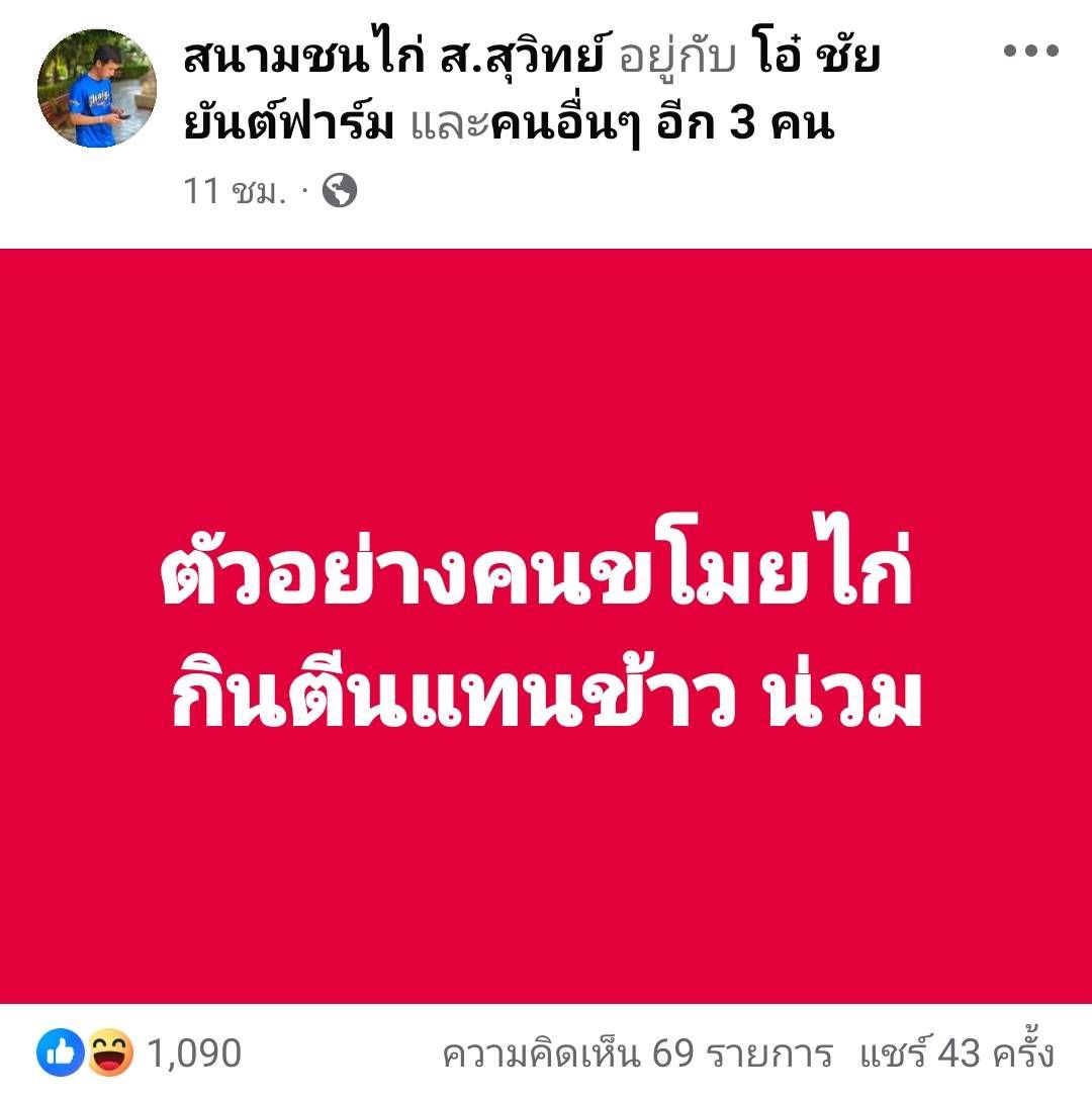 จากบัญชี facebook ชื่อ "สนามชนไก่ส. สุวิทย์" ซึ่งเป็นบัญชีของพี่โอ๋ชัยยันต์ฟาร์ม ออกมาโพสต์ "ตัวอย่างคนขโมยไก่กินตีนแทนข้าวน่วม" ทำเอาคนสนใจเรื่องนี้กันแทบทั้งประเทศ เพราะกระแสลูกของกุมารจีนกำลังร้อนแรงอีกทั้งยังมีนครหลวงและเจ้าสไนเปอร์ที่ทายาทออกชนเงินล้านแทบทุกอาทิตย์ อีกทั้งคนยังต้องการสายพันธุ์ของชัยยันต์ฟาร์มเป็นจำนวนมาก แต่ทางฟาร์มก็ยังแทบจะไม่มีจำหน่ายให้เพียงพอกับความต้องการของลูกค้า แต่ล่าสุดเมื่อวานช่วงบ่ายๆทางพี่โอ๋เองได้ออกมาโพสต์เกี่ยวกับเรื่องนี้ทางทีมงานจริงได้โทรไปสอบถามได้ความว่า
