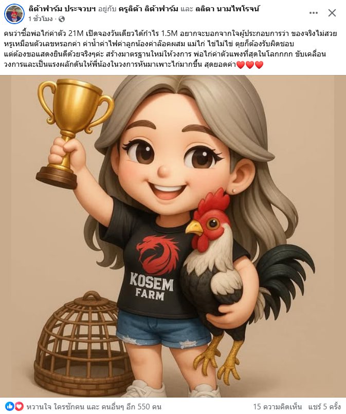อย่างไรก็ตาม ครูลิด้ายังแสดงความยินดีกับเจ้าของพ่อไก่ 21 ล้านรายนี้อย่างจริงใจ พร้อมชื่นชมว่าเป็นการ