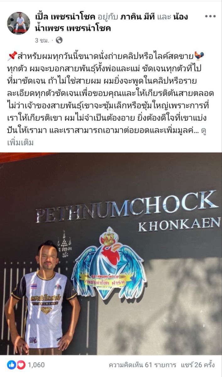 หรือไลฟ์สดขายไก่ชน จะระบุสายพันธุ์อย่างละเอียด ทั้งสายพ่อและสายแม่ รวมถึงที่มาของแต่ละตัวอย่างชัดเจน โดยเฉพาะหากไม่ใช่สายของตนเอง จะยิ่งให้เครดิตต้นสายอย่างตรงไปตรงมา เพื่อแสดงความขอบคุณและให้เกียรติต่อเจ้าของสายพันธุ์ ไม่ว่าจะเป็นซุ้มเล็กหรือซุ้มใหญ่ก็ตาม“ผมไม่อายเลยที่จะพูดถึงซุ้มอื่น ตรงกันข้าม ผมดีใจที่เขาแบ่งปันสายพันธุ์ดี ๆ ให้เรา และเราสามารถนำมาต่อยอด เพิ่มมูลค่าให้สูงขึ้นได้ ถึงเขาจะชอบหรือไม่ชอบเราก็ตาม แต่ผมจะขอบคุณเสมอทุกครั้งที่พูดถึงต้นสายพันธุ์ เพราะผมเชื่อว่า... คนที่ไม่ลืมต้นเหล่า จะเจริญทุกคน”คำกล่าว “ไม่ลืมต้นเหล่า เจริญทุกคน” ซึ่งท่าน สส.เซ้ม เคยกล่าวไว้ ได้กลายเป็นแนวทางที่ผู้เพาะพันธุ์ท่านนี้นำมาปฏิบัติจริงในชีวิตประจำวัน และถือเป็นหัวใจสำคัญของความสำเร็จในวงการไก่ชนการให้เกียรติผู้อื่น การซื่อสัตย์ต่อที่มา และการรู้คุณต้นสายพันธุ์ คือสิ่งที่สะท้อนจิตวิญญาณของคนรักไก่ชนอย่างแท้จริง