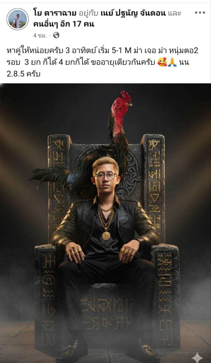 ถือเป็นไก่หนุ่มที่หลายคนจับตามอง ด้วยวัยเพียง 9 เดือน แต่โครงสร้างดี กล้ามแน่น ความไว ความแม่นเริ่มชัดเจน เป็นช่วงอายุที่กำลังน่าลองของจริง ใครมีไก่หนุ่มฟอร์มสดเหมือนกัน งานนี้บอกเลยว่าได้วัดกันสนุกแน่นอนสุดท้ายเสี่ยโยฝากถึงพี่น้องสายไก่ชนทุกท่านมาเจอกันด้วยความจริงใจ คุยกันตรงไปตรงมามีของก็เอามาชน ไม่มีของก็ยังเป็นมิตรต่อกันได้ใครสนใจจับคู่ให้ เจ้ากระทิงดำนี่คือโอกาสดีอีกหนึ่งไฟต์ที่น่าติดตามในช่วงนี้ครับ