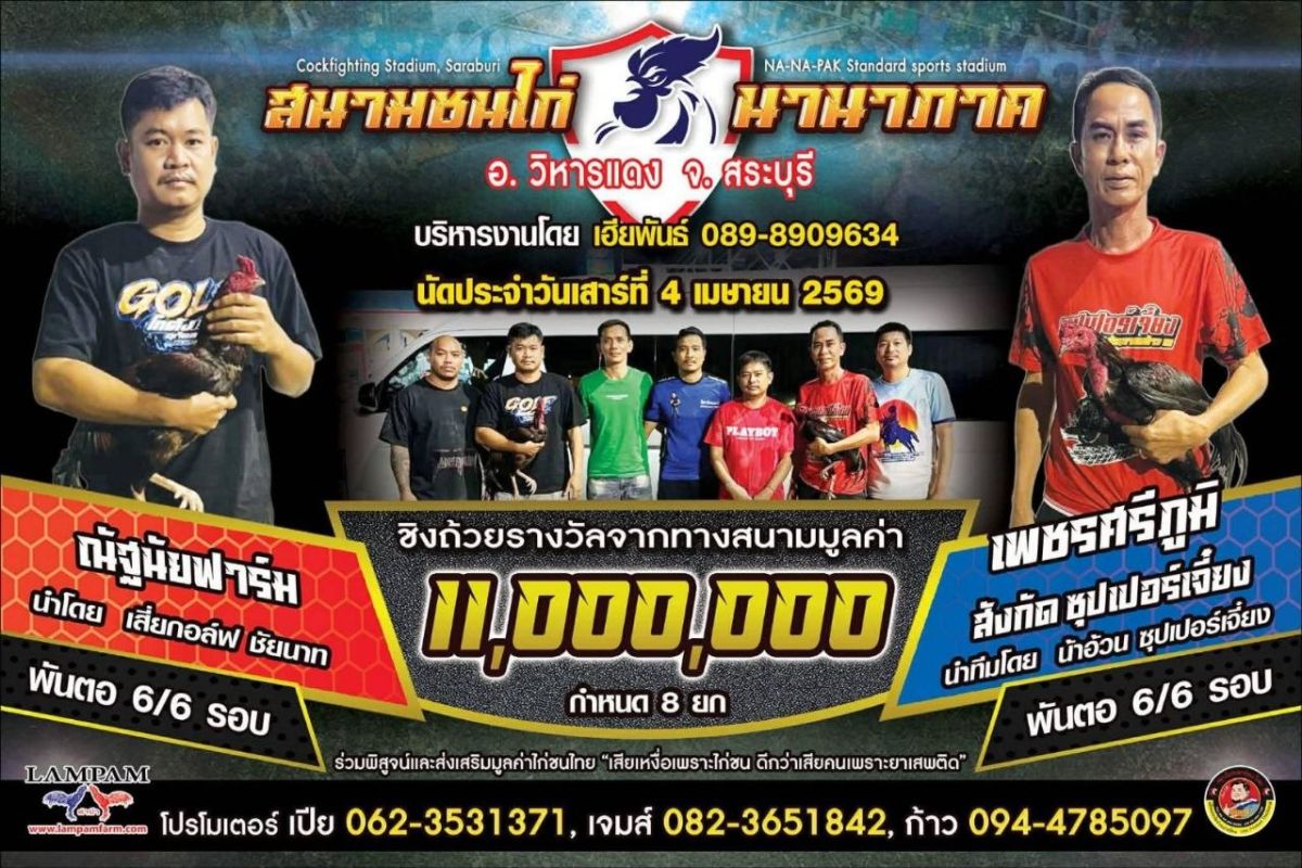 ศึกชิงเงินล้านนัดประวัติศาสตร์สนามชนไก่นานาภาควิหารแดงเจ้าแดงวาสนา ณัฐนัยฟาร์ม ยอดพม่าค่าตัว 200,000 บาท ชิงรางวัล 10,200,000 บาทกำหนด 8 ยก