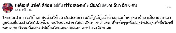 โดยเจ๊กอล์ฟ ออกมาเปิดใจว่า กว่าจะได้ไก่แต่ละตัวออกมาลงสังเวียน