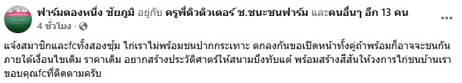 “เราแจ้งสมาชิกและ FC ทั้งสองซุ้มไปแล้วว่า ไก่ของเรายังไม่พร้อมชนจริงๆ อยากให้ทุกอย่างออกมาสมบูรณ์ที่สุด ถ้าทั้งสองฝ่ายพร้อมเมื่อไหร่ ก็พร้อมเปิดหน้าเจอกันใหม่ ภายใต้เงื่อนไขเดิม ราคาเดิม”